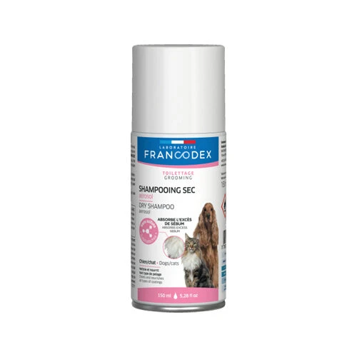 Om de Francodex Dry Shampoo Aerosol te gebruiken, schud u voor gebruik de spuitbus goed. Breng vervolgens gelijkmatig over de gehele vacht van uw hond de droogshampoo aan. Behoud tussen de 20 tot 30 centimeter afstand tussen de vacht en de spuitbus. Masseer vervolgens de droogshampoo voorzichtig in met behulp van uw vingers. Laat de droogshampoo intrekken voor een paar minuten en borstel vervolgens de vacht van uw huisdier uit met een borstel of andere tool.